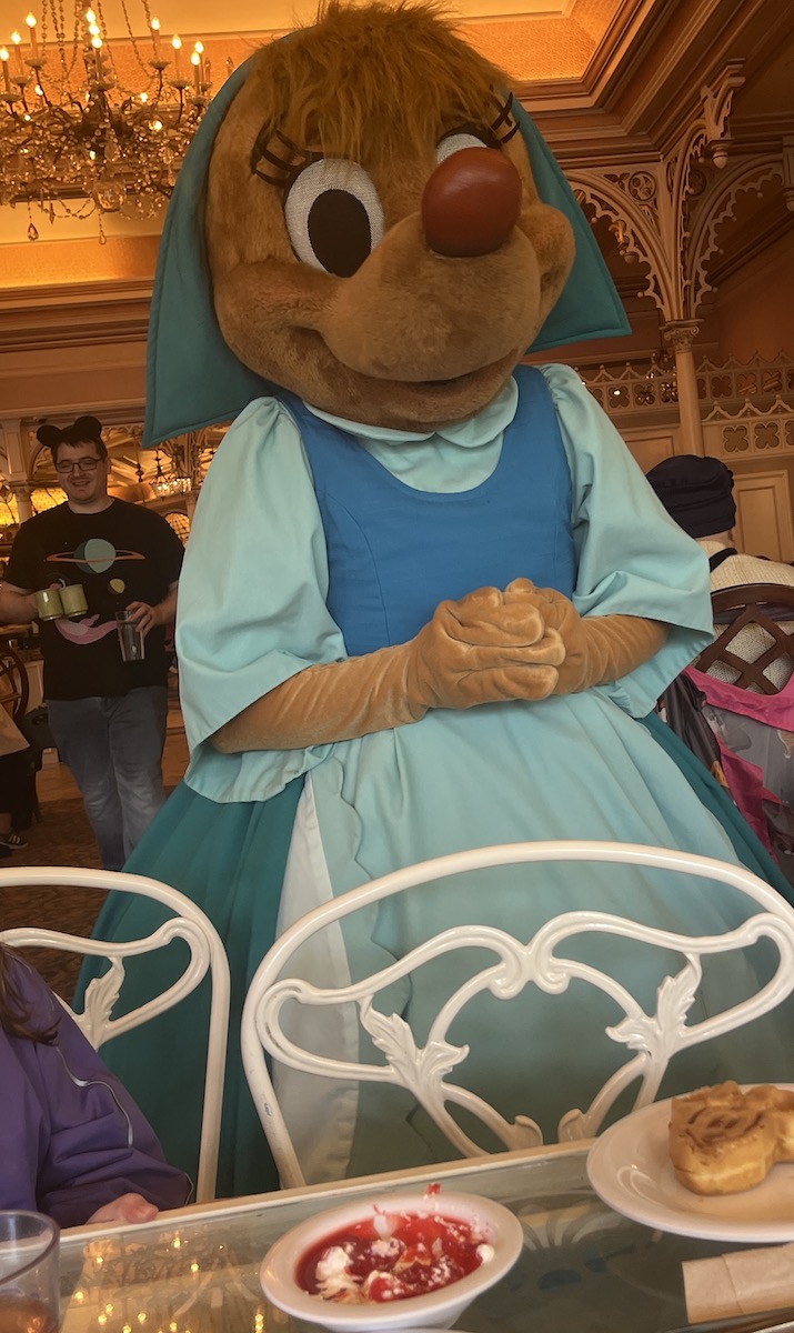 Then, you’re shown to your table where you’re then free to grab breakfast from the many buffet options. The characters roam around the entire restaurant and come to each table. So, my partner ran to get plates for each of us while I sat with the kiddos and we were greeted by the helpful mouse Suzy from Cinderella, Daisy, Chip and Dale, who were hilarious. Pooh Bear also stopped by for big bear hugs. Tigger bounced our way along with Wendy from Peter Pan and Alice herself! Good boy, Pluto, stopped by for a pat on the head.