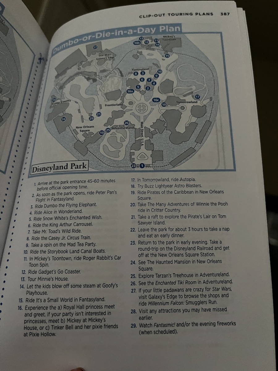 The Unofficial Guide offers many options for walking tours or plans for you or your group. Each unique map is located at the back of the book where you may detach for your own use. This guide offers ideas for both Disneyland and DCA. First, start with their tips on the different types of rides.