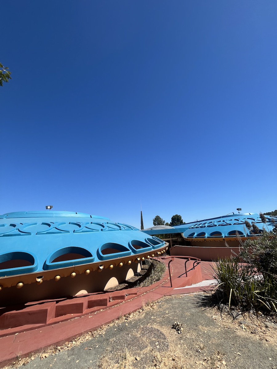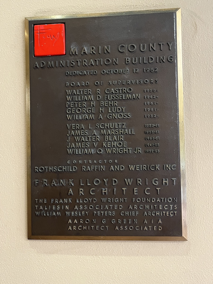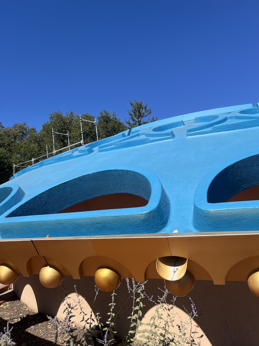 “Originally, Wright wanted a gold roof to match the golden hills of Marin County. However, in the 1960s, there wasn’t any paint or material available that wouldn’t tarnish almost immediately. This is also why the Golden Gate Bridge is red, not gold. In 1962, after his death, Wright’s widow Olgivanna selected a blue similar to the glazed tile that was installed on the domed roof of the Annunciation Greek Orthodox Church in Wisconsin, a building Wright designed in 1956.”