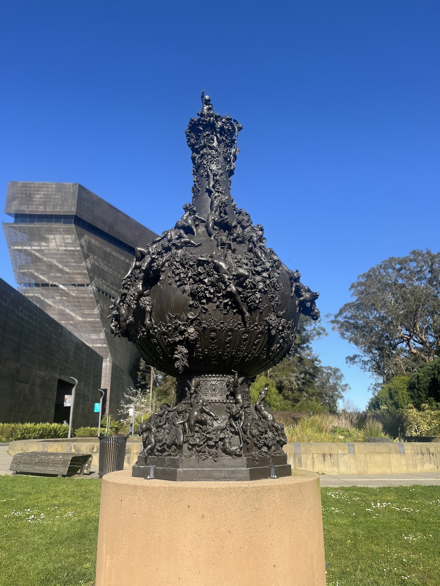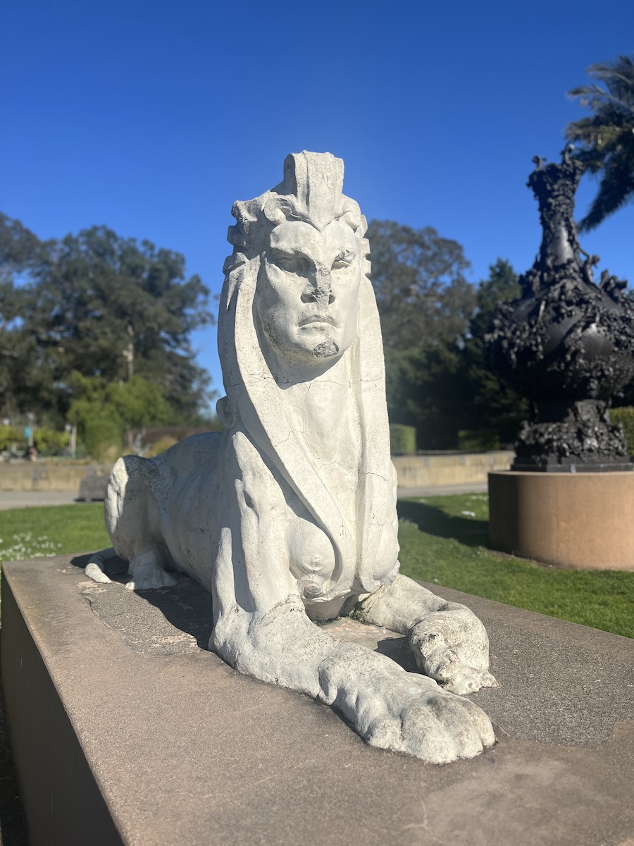 A pair of sphinxes greet you from the original Memorial Museum leftover from the Midwinter Exposition of 1894 and the original de Young museum design.